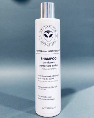Lo shampoo purificante della nostra linea Testamata è privo di SLES e SLS ed è arricchito con attivi vegetali e di natura biologica. La sua formulazione, con l’85% di ingredienti di origine naturale, offre un’azione riequilibrante e lenitiva sulla cute, rimuovendo in maniera delicata qualsiasi tipo di forfora presente sul cuoio capelluto e apportando una leggera idratazione. L’estratto biologico di ortica (urtica dioica (nettle) leaf extract) ha proprietà stimolanti, viene utilizzato per trattare varie malattie della pelle come l’eczema (dermatite) e ripristina la secrezione di sebo a livelli ottimali. L’estratto biologico di rosmarino (rosmarinus officinalis (rosemary) leaf extract) riduce la produzione di sebo in eccesso e ha un’azione purificante e anti-infiammatoria. L’estratto biologico di salvia (salvia officinalis (sage) leaf extract) ha proprietà antibatteriche, aiuta ad alleviare i sintomi di eczema (dermatite) e psoriasi e contiene il beta-sitosterolo, un composto efficace per combattere l’alopecia spesso collegata a queste malattie della pelle.